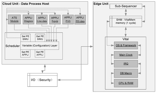 As illustrated in Figure 7, according to migration strategy steps 1 to 2, the non-vital datasets listed in Table 2 are reallocated to the cloud unit during the validation, including PIS data, Diagnostic data, Line data, External Equipment Status, and PAS data. The features of those data are on the computing large-size path. The vital logic-related data, i.e., OS, Framework, Main Clock, IRQ, DB protection Macro, and CPU and RAM status, are integrated into the edge unit.