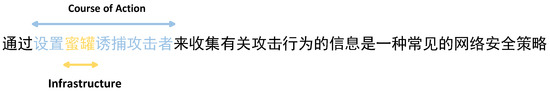 Nested entity example. “She zhi mi guan you bu gong ji zhe” (setting up honeypots to trap attackers) is an entity of the course-of-action type, while “mi guan” (honeypots) is an entity of the infrastructure type, nested within it. The word “tong guo” (by) is followed by either an attack or a defense action, which has a clear direction dependency, while “wang luo an quan ce lue” (network security strategy) is farther away from the entity of the defense action, which has a clear distance dependency.