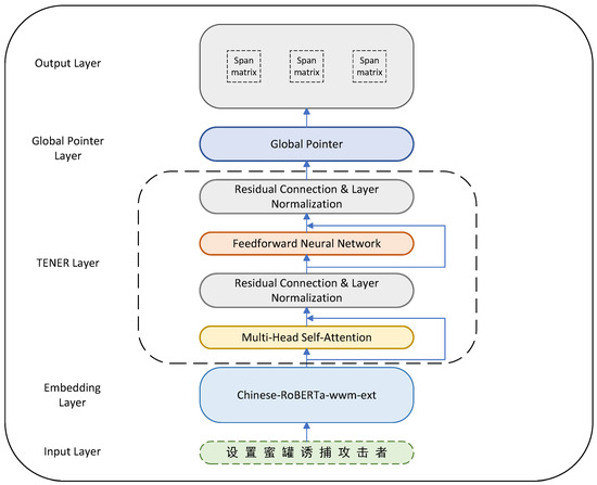 To address the challenge of nested NER in Chinese CTI, we propose a unified model RBTG (RoBERTa-TENER-Global Pointer), which is generalized for flat NER and nested NER. Specifically, for the word embedding layer, we utilize the Chinese-RoBERTa-wwm-ext model [16] pre-trained on the Chinese corpus to capture contextual information for word embeddings and generate word vector representations tailored for Chinese text. For the encoder layer, we use TENER [17] for complex semantic feature extraction, where the direction-aware and distance-aware attention mechanisms make the model fit the direction-dependent and distance-dependent features of CTI. Since TENER is improved based on Transformer, it inherits Transformer’s ability to capture hierarchies and dependencies complex features between entities. For the decoder layer, we use Global Pointer [18] as a label decoder, which scores the span using relative position information and multiplicative attention mechanism to predict the start and end positions of the entities directly from a global perspective and enhance the sensitivity to the boundaries of entities. The main contributions of this work are as follows: