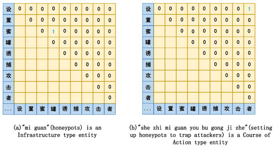 Example of spanning matrix to identify entities in "she zhi mi guan you bu gong ji zhe"(setting up honeypots to trap attackers), where 1 indicates the presence of an entity at the location and 0 indicates the absence of an entity.