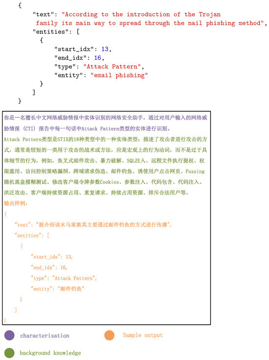 - Writing prompts are used several times to call the API of the LLM to identify each of the six entity types; take the prompts of the attack pattern type as an example, as shown in Figure 5.