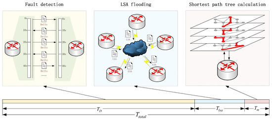OSPF routing convergence refers to the process by which nodes in a network reach a consensus to update routing information following the detection of changes in links or nodes [12,13,14]. This process is illustrated in Figure 1.