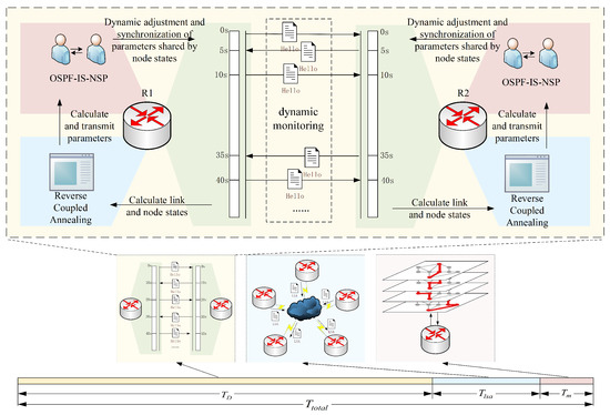 In the OSPF protocol, unifying the configuration of the Hello Interval () and Dead Interval () parameters for all nodes within the same segment is essential for ensuring the stable establishment and continuous maintenance of neighbor relationships. Hello packets primarily facilitate neighbor discovery and fault monitoring. Inconsistent parameter configurations can lead to asymmetries in neighbor state perception, adversely affecting the correct establishment of adjacency relations and timely fault detection. Additionally, parameter consistency synchronizes the time window for fault detection, preventing delays or misjudgments due to variations in . This unification also enables the synchronous propagation of topological state information within the segment, minimizing delays in topology updates. Consequently, this section introduces the OSPF interval synchronization mechanism to ensure parameter consistency among all nodes, providing foundational support for the deployment of the reverse coupled annealing algorithm, as illustrated in Figure 4.