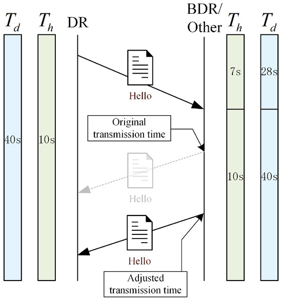 - Once the BDR or other routers receive the Hello message from the DR containing and , they will immediately update their and to 10 s and 40 s, respectively. At the same time, the nodes will adjust their Hello message sending timers and failure detection timers accordingly. As shown in Figure 4, due to the timer adjustments, the sending of Hello messages is delayed by 3 s compared to before. When the next Hello message sending cycle begins, the node will send a Hello message containing the new parameters.