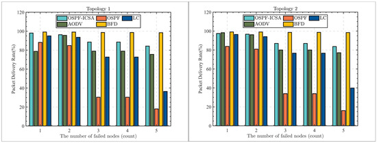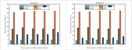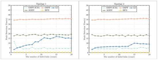 Figure 5 and Figure 6 present a comparative experimental analysis of fault detection times under link failure and node failure scenarios for two different scales of topologies. As shown in the figures, the BFD algorithm demonstrates the best performance in terms of fault detection time, with the shortest detection time. However, the detection speed of OSPF-ICSA is also impressive, with an average fault detection time of approximately 4 s. Compared to the AODV protocol, OSPF-ICSA reduces fault detection time by an average of 74% and 37.38% in the two scenarios, respectively. In comparison to the traditional OSPF protocol, OSPF-ICSA achieves reductions of 86.24% and 87.37%, respectively. Additionally, compared to the load centrality (LC) algorithm, fault detection time is reduced by an average of 34.73% and 40.14%, respectively. These results indicate that OSFP-ICSA significantly enhances fault detection efficiency, second only to the BFD algorithm. Its lower fault detection time is attributed to the OSFP-ICSA algorithm’s ability to respond flexibly and rapidly in the network environment. When network conditions deteriorate, OSFP-ICSA minimizes fault detection time through the reverse coupled annealing algorithm, significantly reducing the detection duration. Topology 1 in Figure 5 shows that, with one link failure, the detection time is 12 s. This occurs because both annealing algorithms reach a dynamic equilibrium at the 12 s mark. Subsequently, as the number of link failures increases, the fault detection time continues to decrease until it reaches its minimum value.