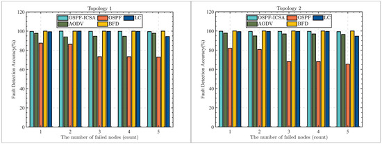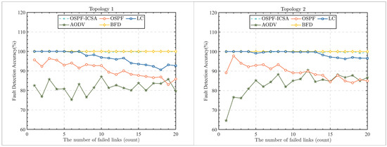 (2) Fault detection accuracy (FDA): The fault detection accuracy is defined as the ratio of the number of successful link fault detections by all OSPF nodes during network simulation to the total number of actual link failures . A higher accuracy indicates better detection precision in the face of link failures, reflecting the responsiveness of the detection mechanism to actual fault events.