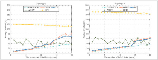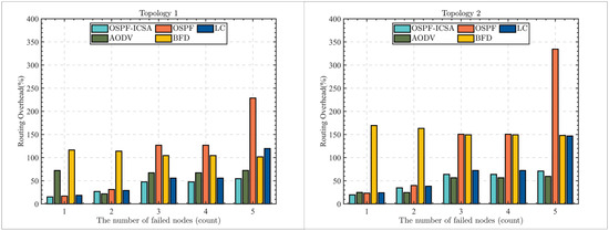 Figure 9 and Figure 10 present a comparative analysis of routing overhead for five algorithms under link failure and node failure scenarios across two different network scales. It is evident that the routing overhead of OSPF-ICSA is generally lower than that of other algorithms. In both link failure and node failure scenarios, OSPF-ICSA achieves lower overhead than the AODV protocol under most conditions, with the exception of the larger topology in the node failure scenario, where it is slightly higher than AODV. Compared to the traditional OSPF protocol, OSPF-ICSA reduces overhead by an average of 21.66% and 44.44%, respectively. When compared to the BFD algorithm, OSPF-ICSA decreases overhead by an average of 63.77%. Additionally, it reduces overhead compared to the load centrality (LC) algorithm by an average of 28.14% and 20.47% in the respective scenarios. This can be attributed to two main factors: first, OSPF-ICSA significantly shortens fault detection time, enabling nodes in the network topology to quickly sense changes, thus increasing the total amount of successfully transmitted packets compared to traditional OSPF and LC algorithms. Second, OSPF-ICSA dynamically adjusts the frequency of Hello message transmissions, reducing the frequency of Hello messages on normal links and, consequently, lowering the overhead of control messages. In contrast, the BFD algorithm incurs higher routing overhead, partly due to its high frequency of probe message transmissions and partly due to false alarms caused by link jitter and congestion, which further increases routing overhead.