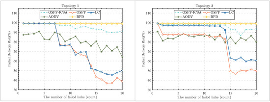(4) Packet delivery rate (PDR): The packet delivery rate is defined as the proportion of successfully transmitted packets to the total packets sent by a node [39,40]. A higher packet delivery rate indicates greater reliability of the routing convergence method.
