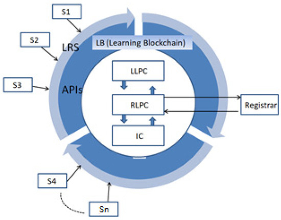 Student S can select any URL in the set learning web project to enter learning browsing. A Registrar is authorized by student users to share their browsing records via the learning blockchain platform. The users’ records include persistent times, data readings, and time stamps for login and logout under the RLPC smart contracts. The learning blockchain application programming interface (LB-API) uses the Ethereum client to program smart contracts with the trigger functions to allow an authorized student (S1–Sn) to access permissioned data, including references, websites, or course files uploaded by the Registrar (Teacher/TA). As illustrated in Figure 5, students S1, S2, and S3 are grouped as a learning team. Through the LLPC smart contract in the LB-APIs, team members share their learning records with authorized people on the same team. The individual learning data generates information when the student first logs in to the platform.