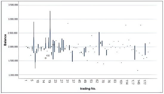 Account balances (from highest to lowest) ranged from 3,290,391 (+64.5%) to 1,152,033 (−42.4%). Notably, the number of trades and total lot size or variety of stocks traded were not proportional to gains or losses. The trading transactions of the students indicated an average of 49 times; however, the spreadsheet denoted that trading numbers were 6–20, exhibiting high levels of performance (Figure 6). The blockchain-based SST program counted daily trades and provided a table and graph that informed traders about completed and uncompleted records.
