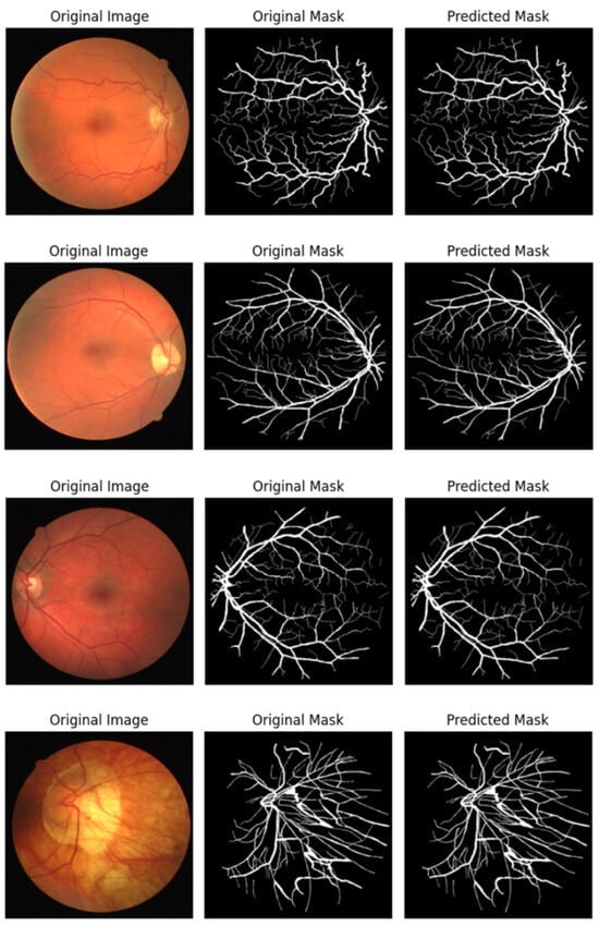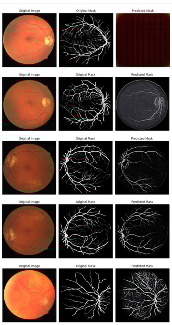 Figure 2 shows a visual comparison of the outputs of the proposed U-Net model trained for retinal vessel segmentation at different training epochs (1, 25, 50, 75, and 100), where each row corresponds to one epoch. There are three columns for each row, as follows: the original image (left), the original mask (middle), and the predicted mask (right).