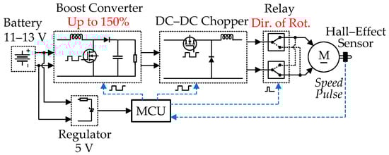 In the proposed drive circuit, in order to keep the bus voltage of the DC-DC chopper above or equal to 12V, the proposed boost converter is activated during starting of the electromechanical system. In this case, when the motor nominal voltage can be kept at the nominal level, higher current is drawn from the input. With the MCU-based closed-loop control system, the bus voltage of the DC-DC chopper and output voltage of the boost converter can be measured and evaluated according to the situation. With control of the bus voltage of the DC-DC chopper circuit, software-controlled power modulation according to the current drawn from the source, it is possible to prevent excessively low voltage at the input. These are protection techniques that can be provided with software.