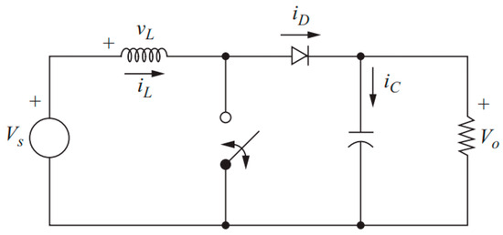 The boost converter given in Figure 3 is responsible for increasing an input voltage to a higher output voltage level. The energy is transferred to the output when the switching component is not conducting. The boost converter’s source voltage (VS), output voltage (VO), minimum inductor value (L), minimum output filter capacitor value (C), and current ripple (ΔIL) are calculated as given below [30].