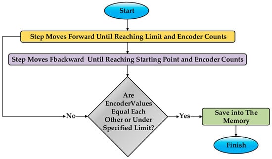 Figure 4 shows the flow chart of the ALA that automatically adjusts the working process of the motor driver system according to the limit value received from the Hall effect sensor. After the motor driver is mounted on the vehicle in which it is used and when the DC motor is first started, the movement limit values are determined by monitoring only the current value drawn from the source and the Hall effect sensor data without any movement scenario. The Hall effect sensor data at the last detected point are temporarily recorded and the step returns to its initial position. Since the distance of the movement in both forward and reverse directions must be equal or very slightly different, the last values obtained from the Hall effect sensor as a result of the forward and reverse movement are compared. If the specified condition is not met, the algorithm does not exit the loop and tries to determine the correct data by working in the forward and reverse directions again. When a full match between the forward and reverse movements or a deviation within the specified threshold value occurs, the limit point data received from the hall effect sensor are recorded in permanent memory. With the determination of the movement limits, the soft start, constant speed, and soft deceleration and stopping operations of the motor are automatically configured.
