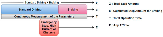 Figure 5 shows the flow chart of the operation of the under-door step system, which is provided with the proposed motor driver and brushed DC motor. In Figure 5, the limit position data of the mechanical step obtained from the Hall effect sensor are expressed as “X”. Here, “X” represents the total number of pulses. The blue standard drive box contains the soft start and steady state, including the operation at rated speed drive section. Under the operating conditions specified with the purple braking box, it starts braking when the limit position is approached and ensures a safe and damage-free stop without a hard hit when the limit position is reached. The “a” variable represents the number of steps required for braking and braking starts when there are steps left until the limit position “a”. The gray box shows that the parameters are monitored with continuous measurements throughout the movement of the mechanical step. Thus, in an unexpected emergency situation, the red emergency stop process is operated due to high current or an obstacle by considering the predefined parameters as current and motion limits. The specified emergency stop process can occur at any “E” moment within the “T” time. The location of the red box is symbolic.