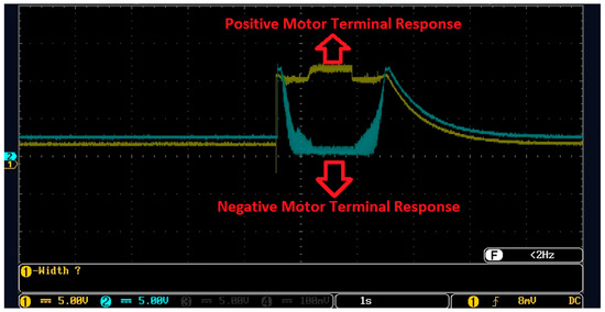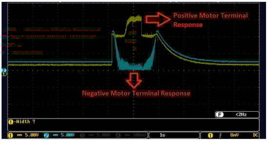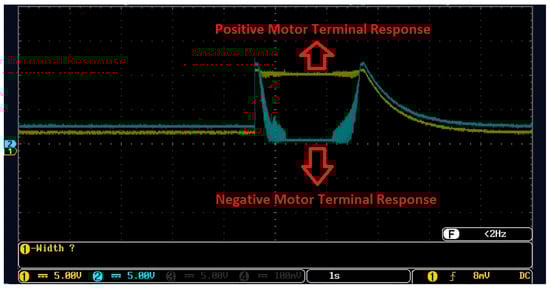 During the experimental tests, the source current value will always be checked to keep the system power in a safe range and under control by using negative temperature coefficient (NTC) sensors which are located near critical components to see the temperature of the driver hardware circuit. The operation time of the system depends on the voltage. If the DC link voltage of the DC-DC chopper is boosted by increasing the duty cycle of the boost converter within a limit, the operation time of the repetitive motion of the electromechanical system decreases. It is observed that the operation time of the repetitive motion of the system is 2039 ms, 1876 ms, and 1824 ms while the duty cycle of the boost converter is applied as 0%, 10%, and 20%, respectively. In Figure 11, Figure 12, and Figure 13, yellow signals show the input voltage and the blue signals show boosted voltage which is applied to the DC-DC chopper as DC link voltage. The DC voltage level is low according to the oscilloscope because of the voltage divider circuit which is designed for voltage level adaptation to the voltage level of the ADC of MCU. In Figure 14, Figure 15, and Figure 16, yellow signals show the motor response measured on a positive terminal and blue signals show a negative terminal response while the proposed brushed DC motor is operated with 0%, 10%, and 20% boost duty cycle, respectively.
