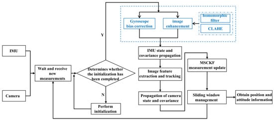 Figure 1 depicts the L-MSCKF algorithm’s general workflow. The low light environment adaptation mechanism of the L-MSCKF algorithm is highlighted in blue in the flow chart; meanwhile, black denotes the parts of the traditional MSCKF algorithm. The inertial measurement data and images are the system inputs. Upon receiving a new measurement, it first checks if the initialization is complete. If not, the initialization process is executed; if the initialization is complete, then the bias correction of the gyroscope is performed and the binocular images are enhanced. The system then moves on to the extraction and tracking of visual features, the augmentation of the camera state and covariance, and the propagation of the IMU state and covariance. Then, the MSCKF measurement process is executed, followed by the sliding window state management. With the goal to accomplish robot positioning, the posture estimate values of the robot are finally output in real time.