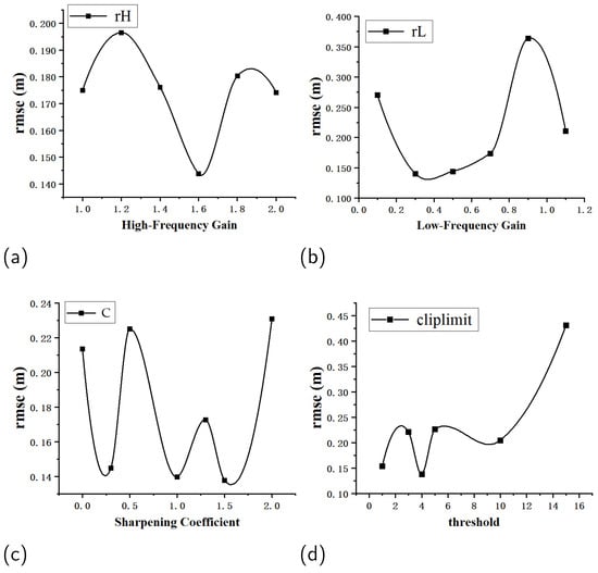The experimental hardware platform utilizes an 11th Gen Intel(R) Core(TM) i9-11900K CPU with a main frequency of 3.50 GHz, an NVIDIA RTX A4000 graphics card, and 64.0 GB of memory; the algorithms proposed herein are implemented in C++ and operate on Ubuntu 20.04 with the ROS Noetic version. Using the MH02 dataset as an example, a controlled variable method is employed to study the impact of each parameter on the enhancement of binocular images, thereby identifying the optimal settings. Figure 2 shows the outcomes of the experiments.