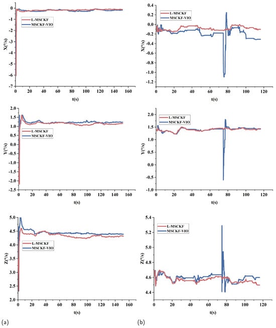 Figure 4 displays the fluctuation trends of the estimated gyroscope bias coefficients after the IMU bias correction by the MSCKF-VIO algorithm on the MH02 and V203 sequences. In Figure 4, the bias estimates for the three coordinate axes of the L-MSCKF and MSCKF-VIO algorithms are compared, with L-MSCKF represented in red and MSCKF-VIO in blue. It is evident from the figure that the traditional MSCKF-VIO algorithm exhibits significant fluctuations in the estimated gyroscope biases during testing on these sequences. Such fluctuations not only affect the stability of pose estimation but could also potentially degrade the accuracy of the overall VIO pose estimation. However, the L-MSCKF algorithm effectively mitigates these disturbances by incorporating acceleration measurements to update the gyroscope bias coefficients, thus enhancing the precision of VIO pose estimation.