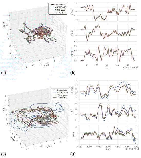 Figure 5 illustrates the trajectory comparison between the improved algorithm and the original algorithm MSCKF-VIO and VINS-mono in difficult scenes V103 and V203. The actual drone flight path supplied by each data packet is shown by the black dotted line in Figure 5. The red line, the blue line, and the green solid line indicate the trajectories obtained by L-MSCKF, MSCKF-VIO, and VINS-mono, respectively. The three algorithms’ respective trajectories on the sequences V103 and V203 are displayed in Figure 5a,c. To present the trajectory deviation of the algorithm more intuitively, the trajectory comparison between the algorithms on the three axes is shown in Figure 5b,d, respectively. In the V103 sequence, the trajectory of the L-MSCKF algorithm closely aligns with the true trajectory, demonstrating good consistency. Particularly at the curved sections of the trajectory, while the VINS-mono and MSCKF-VIO algorithms exhibit some deviation, the L-MSCKF algorithm maintains proximity to the true values. In the V203 sequence, the L-MSCKF algorithm shows a more significant accuracy advantage compared to the MSCKF-VIO and VINS-mono algorithms. Even in areas where MSCKF-VIO deviates significantly from the true values, the trajectory of the L-MSCKF algorithm remains with a small margin of error. Figure 5b,d demonstrate that the L-MSCKF algorithm exhibits relatively stable performance across all three axes, deviating only minimally from the true trajectory. In contrast, the MSCKF-VIO and VINS-mono algorithms exhibit larger deviations, particularly at the beginning and end of the path and particularly on the Y and Z axes.