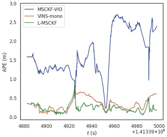 In Table 4, which pertains to the assessment of rotational error, the L-MSCKF algorithm demonstrates a marginally superior level of precision compared to MSCKF-VIO, with this advantage being particularly pronounced in contrast with VINS-mono. By comprehensively analyzing the data in Table 3 and Table 4, we can conclude that the primary advantage of L-MSCKF lies in the precision of the trajectory. Figure 6 further illustrates that the trajectory errors of MSCKF-VIO and VINS-mono begin to increase significantly in the timeframes with a higher prevalence of dark scenes, whereas L-MSCKF consistently maintains a lower error range. L-MSCKF benefits from its image enhancement and gyroscope bias correction technologies, enabling it to obtain more accurate data at the initial stage. Therefore, the error during the initial time period is significantly lower than that of MSCKF-VIO. Subsequently, under poor illumination conditions, the image enhancement of L-MSCKF comes into play, ensuring that a satisfactory count of feature points can still be extracted from the camera data, thereby maintaining positioning accuracy.