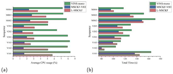 Figure 7 presents a comparison of the computing resources and duration of the L-MSCKF, MSCKF-VIO, and VINS-mono algorithms based on the dataset in Table 3. Figure 7a illustrates the average CPU utilization of each algorithm as a percentage of the total available CPU, while Figure 7b depicts their total running times. In the figures, green represents VINS-mono, blue represents MSCKF-VIO, and red represents L-MSCKF. The MSCKF-VIO algorithm, being relatively simple, requires the least CPU resources and time. Conversely, the improved L-MSCKF algorithm, which includes additional enhancement and correction processes for both camera and IMU data, incurs increased CPU resource demands and processing time, particularly in terms of CPU consumption. Nevertheless, it still utilizes fewer resources compared to the VINS-mono algorithm that employs non-linear optimization. The Extended Kalman Filter structure serves as the foundation for both the L-MSCKF and MSCKF-VIO algorithms. During computation, they limit the number of historical camera states involved in error construction by constraining the sliding window’s length. Furthermore, techniques such as QR decomposition are employed to further reduce the dimensionality of the observation matrix.