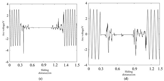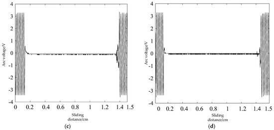 In the OLTC simulation test, the contact time of the dynamic/static contacts is shortened with an increase in sliding speed, resulting in a change in the arc voltage waveform. The contact state changes from static to dynamic with significant resistance fluctuations, affecting the arc generation and disappearance process. Voltage fluctuations and contact wear intensify with increasing speed, as shown in Figure 4. Faster sliding speeds may shorten the arc duration and increase the voltage peak, while slower sliding speeds prolong the arc duration and decrease the voltage peak. As the sliding speed increases, the dynamic interaction between contacts becomes more erratic, leading to greater voltage fluctuations and intensified wear due to increased mechanical vibrations and instability in the electrical contact. Faster speeds reduce the time contacts remain engaged, causing shorter arc durations and higher voltage peaks, while slower speeds allow a longer contact engagement, resulting in prolonged arc durations and lower voltage peaks.