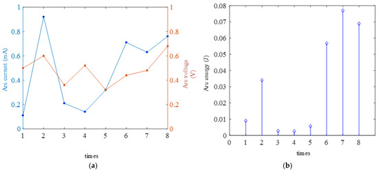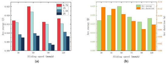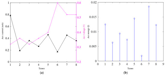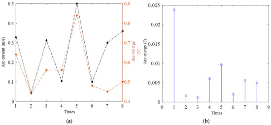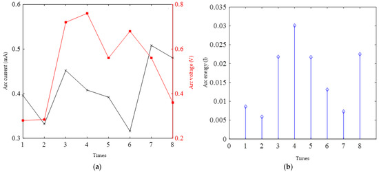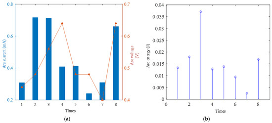 Figure 11. Contact pressure F = 1.5 N. (a) Change in voltage and current; (b) change in arc energy.