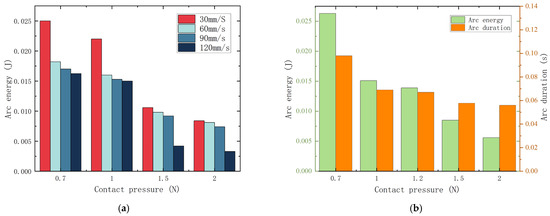 The effect of contact pressure on the arc energy waveform is shown in Figure 7; the arc energy decreases with an increase in contact pressure, and when the contact pressure exceeds 1.5 N, this decrease decreases and the change tends to be stable. The arc duration also decreases with increasing contact pressure. Increasing the contact pressure improves the contact quality of the contacts, reduces the generation and intensity of the arc, and thus effectively suppresses the arc discharge frequency [33].