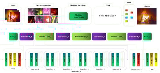 Modified Miti-DETR using modified DenseNet121. Dense blocks—stages with densely connected layers to improve feature reuse. Transition layers—convolution and pooling layers for use downsampling. Modified blocks—additional convolutional layers used to enhance feature extraction. Structured pruning reduces model size while maintaining its performance.