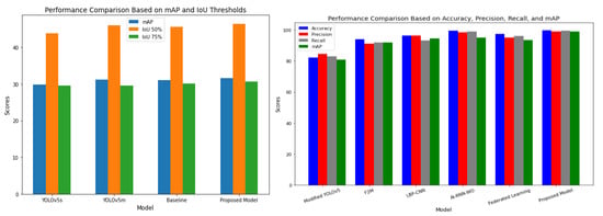 In this paper, we utilize a comprehensive suite of metrics to evaluate the performance of the models and compare them with the results of the proposed model. These metrics include the mean average precision (mAP), used to assess overall accuracy, and Intersection over Union (IoU), used to gauge the accuracy of object localization. Additionally, we measure recall to understand the ability of the models to identify relevant instances, and precision to evaluate their accuracy in predicting labels.
