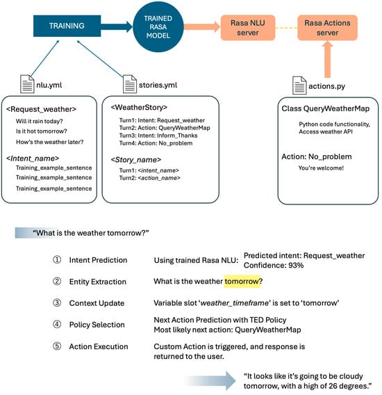 Rasa performs several key tasks: intent classification, entity extraction, and prediction of the next action. For example, the user might ask something like, “What is the weather like today in Tokyo?”. Rasa uses supervised machine learning models to classify user inputs into predefined intents; i.e., there may be a predefined system labelled as “request_weather”. Entities such as dates (today) and locations (Tokyo) can be extracted from the user input, as the Rasa model is trained on labelled data wherein both examples of user utterances that would be expected to fall under a predefined intent are listed, and examples of entities are delineated in the example sentences.