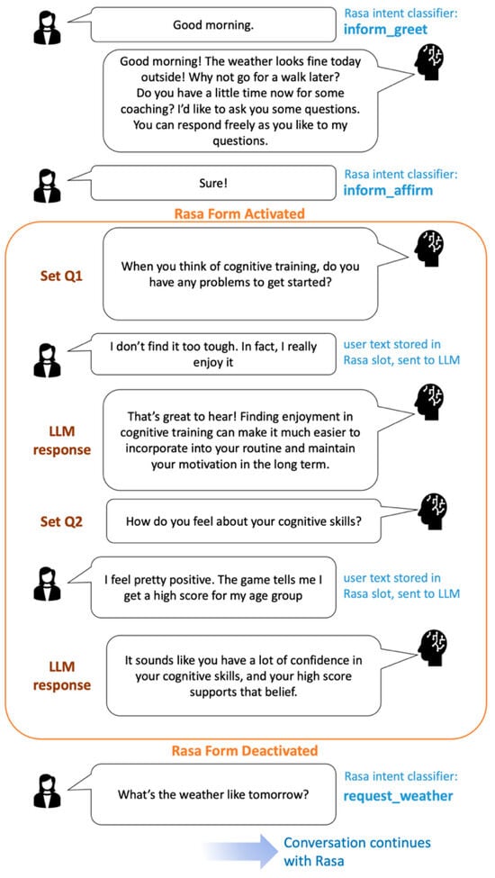 Example conversation diagram. After making a greeting, if the user agrees to start coaching, the system will ask the user two questions from one domain set, randomly chosen from the list shown in Table 2. The user is free to deny or ignore and talk about something else. If the user makes an “affirm” intent, then a Rasa Form is activated, which stores the user text without performing intent classification, but delivers it directly to an LLM, and the response from the LLM is returned to the user.