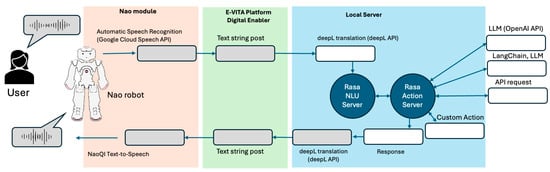 For concerns about user privacy in their home, Nao was designed so that the user needs to hold the left foot button of Nao, which makes the microphone of Nao start recording. Upon release of the button, the microphone is stopped, the audio file is transcribed locally on Nao using a Google Automatic Speech Recognition (ASR) library (Google LLC, Menlo Park, CA, USA), and the text data are sent to the Digital Enabler, then on to the Rasa server, and then the text reply is returned through the Digital Enabler back to the robot, which uses Nao’s text-to-speech (TTS) to generate a spoken reply, as shown in Figure 3. The response time from the user finishing their speech until Nao starts speaking in reply was around 5–10 s (observed during the installation of the robot).
