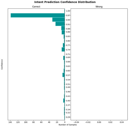 Intent prediction histogram. This histogram visualizes the confidence for all predictions based on the training data, with the correct and incorrect predictions being displayed on the left or right sides respectively. In our test, there were no incorrect predictions, and the majority of the correct samples were predicted with high confidence.