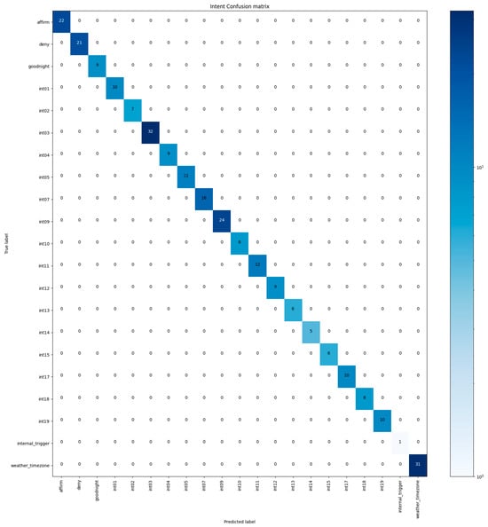 Intent confusion matrix. This confusion matrix demonstrates the performance of the Natural Language Understanding model on the training data. The absence of off-diagonal terms indicates that the model correctly classified all intents, i.e., the intent training example sentences are well-differentiated.