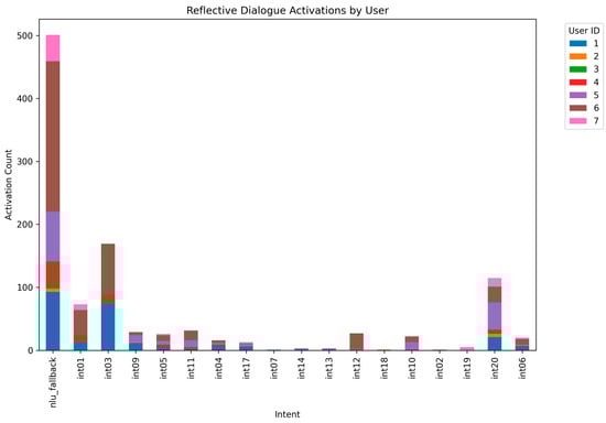 We have summarized the total interactions made by users during the study in Table 6. A total of 1057 user intents were classified during the study based on user input. Figure 6 shows the breakdown of classified intents by user ID. The users were not aware of any of the intents in the system (including the existence of the PDF knowledge base), only that the system utilized AI to respond to user input. As anticipated, a large proportion of user input could not be predicted as one of the Rasa intents with confidence greater than 30%, and the Fallback was activated a large number of times (47% of all interactions). Almost 16% of user speech was predicted as intent_03, which relates to asking about health information, wherein the system queries the PDF knowledge base through LangChain to return a response to the user.