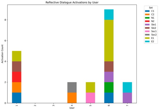 The activations of the reflective dialogue component by user. User ID 6 activated the reflective dialogue 9 times over the course of 2 weeks, experiencing reflection relating to exercise the most. Two users failed to activate the reflective dialogue during the study. Set C = Cognitive, N = Nutrition, Sle = Sleep, Soc = Social activity, E = Exercise.