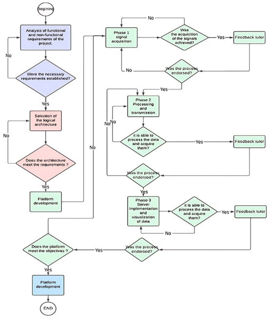 Subsequently, the platform implementation was divided into three phases: signal acquisition, signal processing, and data implementation and visualization. Each of these phases is further divided into smaller tasks that are continuously executed to address any errors and improve the implemented processes.