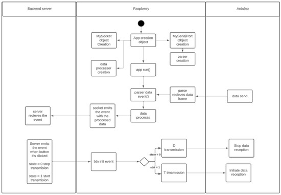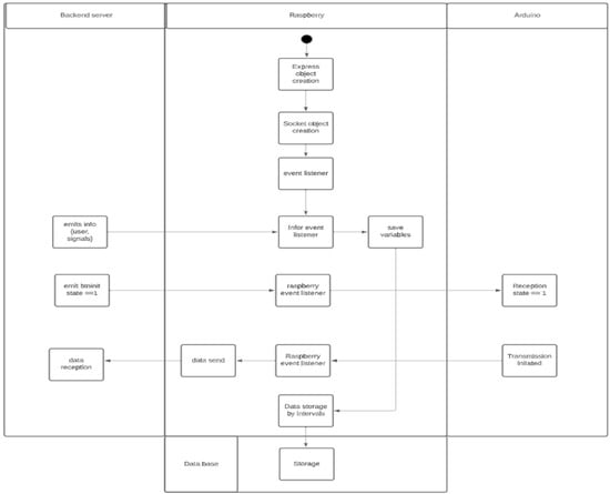 Figure 5 shows a diagram showing the architecture of a data transmission system involving three main components: a backend server, a Raspberry Pi, and an Arduino. A step-by-step description of the illustrated processes is shown below.