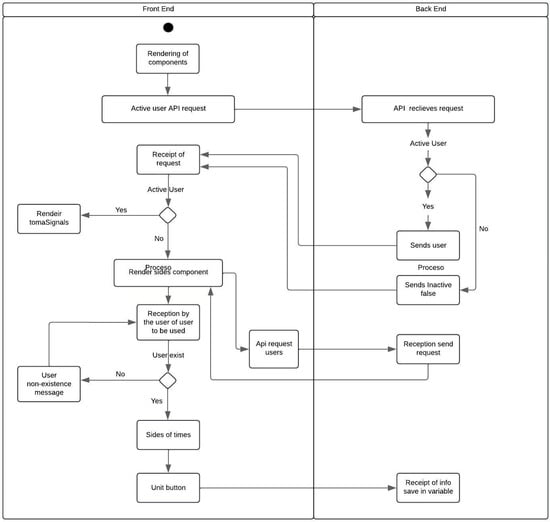 Signal and User Storage System: It expects the information event, which allows for obtaining the acquired signal data from the previous system. Here, the sampling time of each signal is abstracted and assigned to a timer that takes samples each time it runs, acquiring the signal data through the data event. These data are then saved in the user’s table obtained from the information event. It is worth noting that the system has low latency because the database and backend are on the same server.
