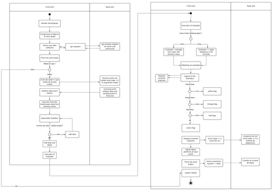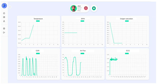 Finally, once the data collection has started, the system waits for the user to decide whether to continue or stop the data acquisition. If the acquisition is stopped, the system is not completely reset, allowing the user to continue working with the same profile and previously established sampling times. To stop the acquisition, the “state == 0” status is sent to the backend, which halts the data transmission and clears the graphs, resetting them to their initial values. It is important to note that at this point, the active user is not removed from the database. If the decision is made to restart the entire process, the previously described steps are followed, but a false status is sent for the active user, bringing the page back to its initial state where a new user can be selected along with their corresponding values. The