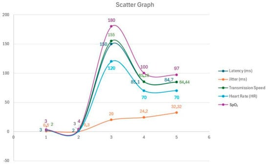 Notably, the jitter metric, which remains at relatively low values, shows minimal variation, indicating high stability and minimal latency influence. This stability is a crucial advantage, as consistent jitter levels are essential for applications requiring precise timing and data consistency.