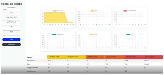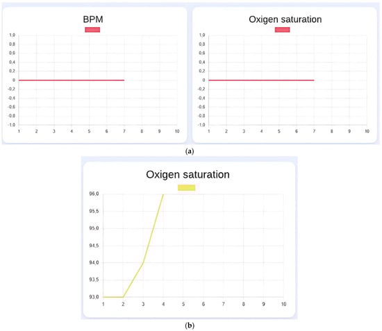 Meanwhile, the evaluator controller is also executed, responsible for setting the current flag on the graph. The flag evaluation is conditioned based on the specific graph. For signals with long sampling times, such as the temperature, pulse oximeter, and heart rate, the average of the current and previous data points is obtained. For signals with short sampling times, such as airflow and EKG, the number of peaks obtained in a minute is evaluated to determine the frequency of these signals. This process is particularly useful for detecting patterns in the signals. After obtaining this value, a request is made to the “info” element stored in the “public” folder, where these values can be modified by accessing the JSON file. The limits for each flag can be seen in