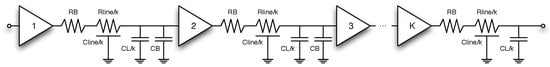 In order to define the propagation delay model, let us first consider the general modular system shown in Figure 1, which is supposed to operate at low frequencies (i.e., not exceeding the MHz regime). Such a system consists of a line distributing the digital signal to the n modules, each featuring an input capacitance loading the line itself. The line is characterized by an overall resistance and an overall capacitance , whose values depend linearly on the line length L []. The delay model is shown in Figure 2 for a uniform line divided into k sections, each driven by a minimum-size buffer. Each line section, long, is modeled by a distributed RC circuit, where both and are divided by a factor of k. The capacitance, given by the total modules’ input capacitance, , is divided by the same factor. The input of the buffer is modeled by means of a fixed capacitance , whereas models its driving capability. The values of capacitance and resistance depend on the buffer input and output transistors’ size, respectively.
