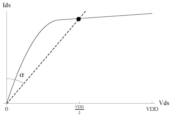 In this work, is referred to as the on-resistance of the output MOS transistors biased with a gate-to-source voltage equal to (i.e., the maximum allowed supply voltage), and with a drain-to-source voltage equal to . A geometrical interpretation of is given in Figure 3, where the value of such a resistance is visualized by the angle with respect to the y-axis of the characteristic of the output transistor. The propagation delay of the line with k minimum-size buffers used as repeaters can be expressed as
