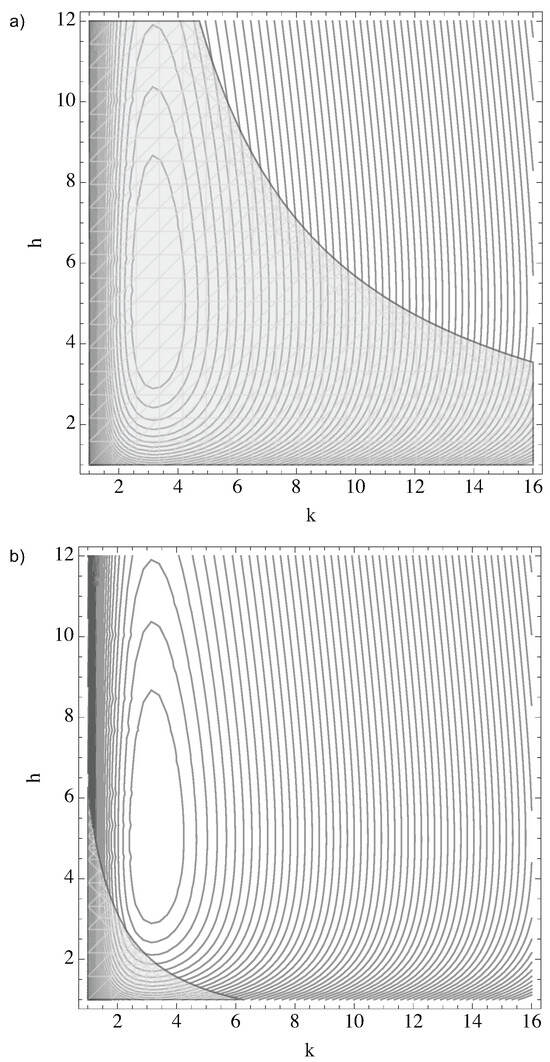 By considering only positive values for the variables h and k (i.e., only physically meaningful values) and that all the parameters in (7) are positive real constants, it is possible to conclude that the second derivatives are positive. Hence, H () is positive semi-definite and, in turn, is convex.