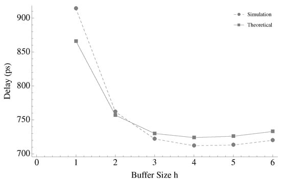 where the parameter takes into account the intrinsic delay of the minimum-size buffer, mainly depending on the number of the stages making up the buffer. It is worth noting that the concept of a “minimum-size buffer” used throughout this work is somehow arbitrary: we define it as the buffer able to properly drive a segment long of the line. For a two-stage buffer in the 65 nm commercial technology used in circuit simulations reported in Section 4, is close to 60 ps. Its value can be obtained by simulating an unloaded buffer or via a calculation as reported in []. The value of such a parameter does not change with the buffer dimension as the increase in input capacitance of the ith stage in the buffer is compensated by the increase in the driving capability of the th stage.