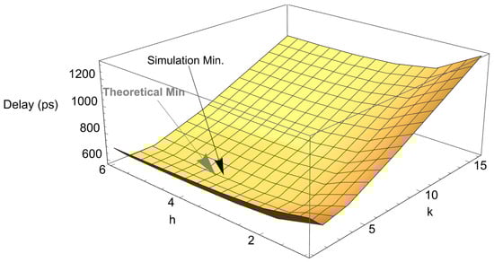Propagation delay as a function of h and k for a distribution line featuring = 6 pF and = 220 Ω. The black arrow points to the optimum coordinate obtained by means of circuit simulations, whereas the gray arrow points to the coordinate obtained by calculations.