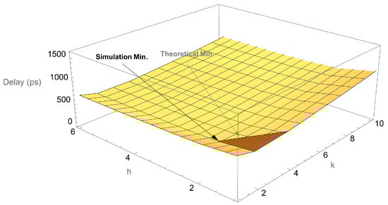 Note that has not scaled with h, as previously mentioned.Optimal values for h and k, that is, the values which guarantee the minimum propagation delay, can easily be obtained by setting and :